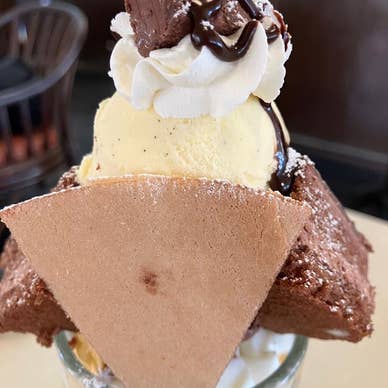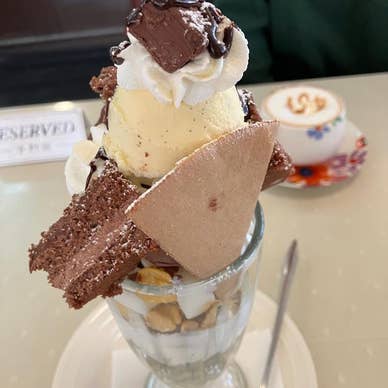 CATY キャティ 倉敷市松島にあるカフェです。 今日の夕方に訪問しました。 メニュー表を見てショコラパフェとホットキャラメルラテをオーダーしました。 ショコラパフェは、バニラアイスとチョコアイスに生クリーム、杏仁豆腐、オレオクッキー、ミニケーキが3個も付いていました。 ボリュームたっぷりで美味しかったです。 ホットキャラメルラテもアツアツで甘くて美味しかったです。 ごちそうさまでした♪