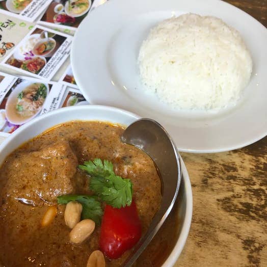 チキンライスうま!なにこれ、なんの味?うま。と感動しながら食べてました。タレはにんにくが効いているのかな?食べたことのない味なのに食べやすい。タイ米がまたうまい。アルデンテのパスタみたい。こんなに美味しかったんだと感動。