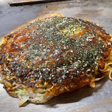 三原駅から徒歩3分の老舗お好み焼き屋は、昭和38年創業の伝統を活かし、三原市ならではの鶏モツ入り“三原焼き”を目の前で丁寧に焼き上げてくれます。ふんわりした生地にたっぷりのキャベツ、エビやイカ、牛や豚、卵など具だくさんで、特製のまろやかで甘辛いソースもクセになります。焼き上がる様子をライブ感覚で楽しみながら、大きめサイズのお好み焼きでボリュームも満点。鶏モツならではのコリコリとした歯ごたえや旨味、鉄板で仕上げる香ばしさも魅力です。盛況のため行列ができやすいですが、予約も可能。三原のご当地グルメとして一度は味わいたい一軒です。