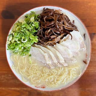 福岡市博多区 【呉服町駅】 看板の無いラーメン屋さん 以前は紹介制で一見さんお断りだったが今は解除され誰でも入れるようになってます。 - - - - - - - - - - - - - - - - - - - - - ▪️チャーシューキクラゲネギラーメン - - - - - - - - - - - - - - - - - - - - - ★土曜の19時過ぎ、待ち無し。 店内9割の入りでほぼ満席。 看板が無いけれど、入り口に青いバケツがぶら下がっていたら営業中! せっかくなので全部入りの「チャーシューキクラゲネギラーメン」を口頭注文。 8-9分ほどで着ラー。 真っ白なラーメン! 真っ白なチャーシュー! そこに山盛りのネギとキクラゲ! 山盛りのキクラゲが「嬉しい!」と思いましたが、後から後悔する事に・・・(ーー;) 食べても食べても減らないんです・・・ 麺の量と同じくらい入っているんじゃないかと思うくらい「マジか?」というくらい入ってました これは異常なくらいの量ですわ(・・;) と、いきなりネガティブな話になってしまいましたが(^^;; まずは、スープを一口。 旨い! 確かにクリーミー! 真っ白にそぐわず、かなりクリアな品の有る豚骨スープ! 半端ないまろやかさの中にもコクが有る! まるでポタージュな感じもする美味しいスープ! 確かに「唯一無二」と言うだけのスープですね。 麺は極細ストレート。 これが凄かった! 小麦の香りも良く、コシがある! しかも最後まで麺が伸びた感じがなかったです。 これは美味しかった! これも唯一無二の麺ですね。 チャーシューは見た目通り? 柔らかくは無い。 あまり美味しいとは思わなかったなぁ… 昔は店内かなり緊張感の有るお店。 らーめん自体も評判でしたが、それ以外でかなり話題になっていたラーメン屋さんです。 今では店内緊張感も無く普通のラーメン店な感じ。 緊張感の有る店内も経験してみたかったな(笑) ご馳走様でした。 - - - - - - - - - - - - - - - - - ・住所/福岡市博多区下呉服町4−31−1 ・営業時間/11:00〜20:00 ・定休日/無し ・席/カウンター、テーブル ・支払い/現金 ・駐車場/無し ・最寄り駅/呉服町駅(約350m) - - - - - - - - - - - - - - - - - ※2025.9現在
