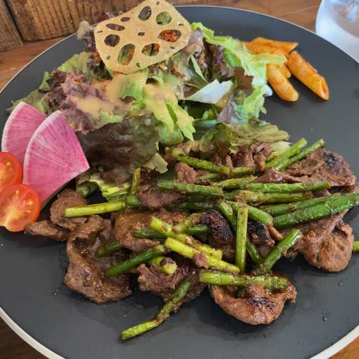 高タンパク・低カロリーな北海道産エゾシカ肉を、にんにくの芽と専用ソースで炒めたジビエランチ。クセがなく、しっとりとした新感覚の食感でとても食べやすく美味しい一皿でした。
