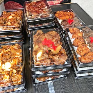 店頭で弁当を売ってます。すべて500円。焼き肉弁当、ハンバーグ弁当、豚カツ弁当みたいなくみあわせで数種類並んでます。焼き肉と豚カツの組み合わせの物を選びました。肉食の人の弁当ですね。焼き肉の味は美味しい。ライスも美味しい。