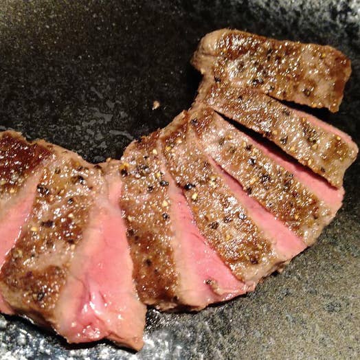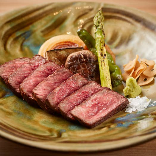 究極のクリスピー焼きは、絶妙な火加減で焼かれたステーキは、自家製のタレや山葵、塩など自分好みの味で楽しめました♫