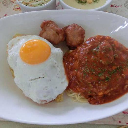 メニュー構成は、サラダ、アヒージョ、シンガポールチキン、ハンバーグ、オムライス、ピラフ、パスタ、ピザなどで焼肉、ステーキの類はない。