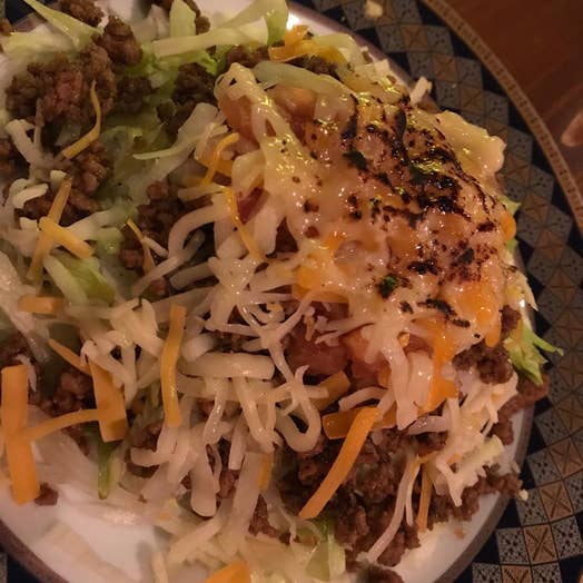 こんがりトロリのチーズとホットなタコスミートのタコライスが出来上がり。この香ばしさといい匂いがライスとレタスを包みます。